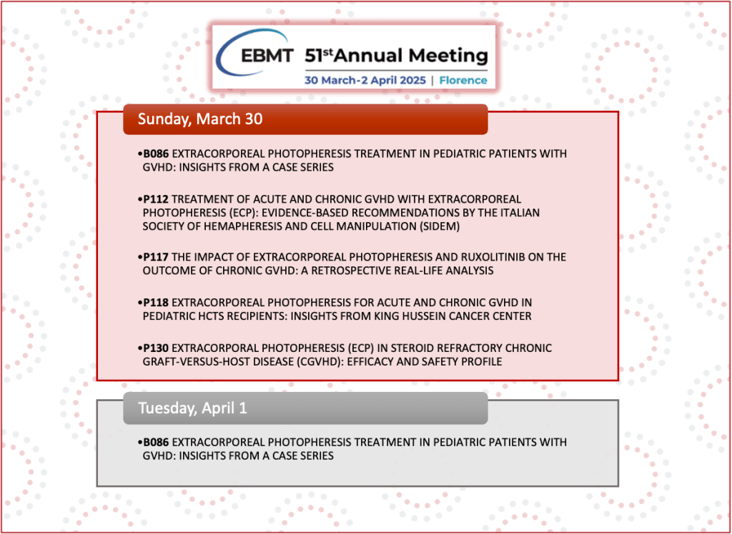 Are you attending the EBMT 2025 Annual Meeting in Florence this year? This prestigious event promises to deliver the latest advancements in hematopoietic cell transplantation and cellular therapies, and we’ve done the hard work for you by scouring the programme for extracorporeal photopheresis (ECP) abstracts.