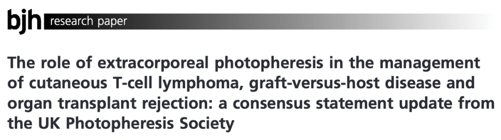 Extracorporeal photopheresis (ECP) has been used for over 35 years in the treatment of erythrodermic cutaneous T-cell lymphoma (CTCL) and over 20 years for chronic and acute graft-versus-host disease (GvHD) and solid organ transplant rejection. ECP for CTCL and GvHD is available at specialised centres across the UK. The lack of prospective randomised trials in ECP led to the development of UK Consensus Statements for patient selection, treatment schedules, monitoring protocols and patient assessment criteria for ECP. The recent literature has been reviewed and considered when writing this update. Most notably, the national transition from the UVAR XTS® machine to the new CELLEX machine for ECP with dual access and a shorter treatment time has led to relevant changes in these schedules. This consensus statement updates the previous statement from 2007 on the treatment of CTCL and GvHD with ECP using evidence based medicine and best medical practise and includes guidelines for both children and adults.