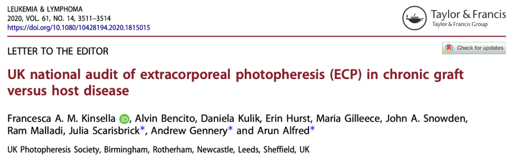 This large audit of UK practice supports further prospective studies and clinical trials to define the best use of ECP in controlling cGvHD in the first line of treatment; for example, alongside standard of care. In addition, scientific studies of biomarkers of GvHD should be associated with prospective clinical data acquisition in both routine service and clinical trial delivery of ECP.