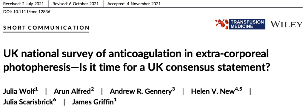 Background: Extra-corporeal photopheresis (ECP) requires anticoagulation to pre- vent circuit clotting. Unfractionated heparin (UFH) is currently the only anticoagulant licensed for the ECP system in use in the United Kingdom (UK). Acid citrate dextrose-A (ACD-A) is the preferred anticoagulant for most other apheresis proce- dures. Anecdotal evidence suggested variability in ECP practice across the UK with some providers using off-label ACD-A.